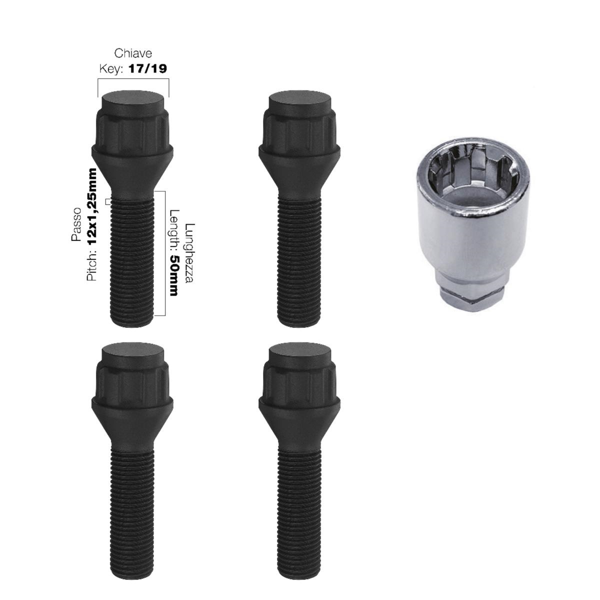 Kit bulloni ruota antifurto neri conici 12x1,25 lunghezza 50 mm – acciaio zincato