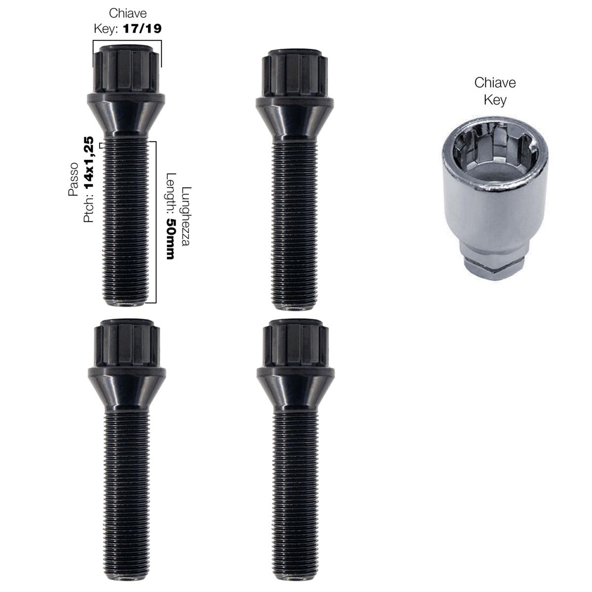 Kit bulloni ruota antifurto neri conici 14x1,25 lunghezza 50 mm – acciaio zincato