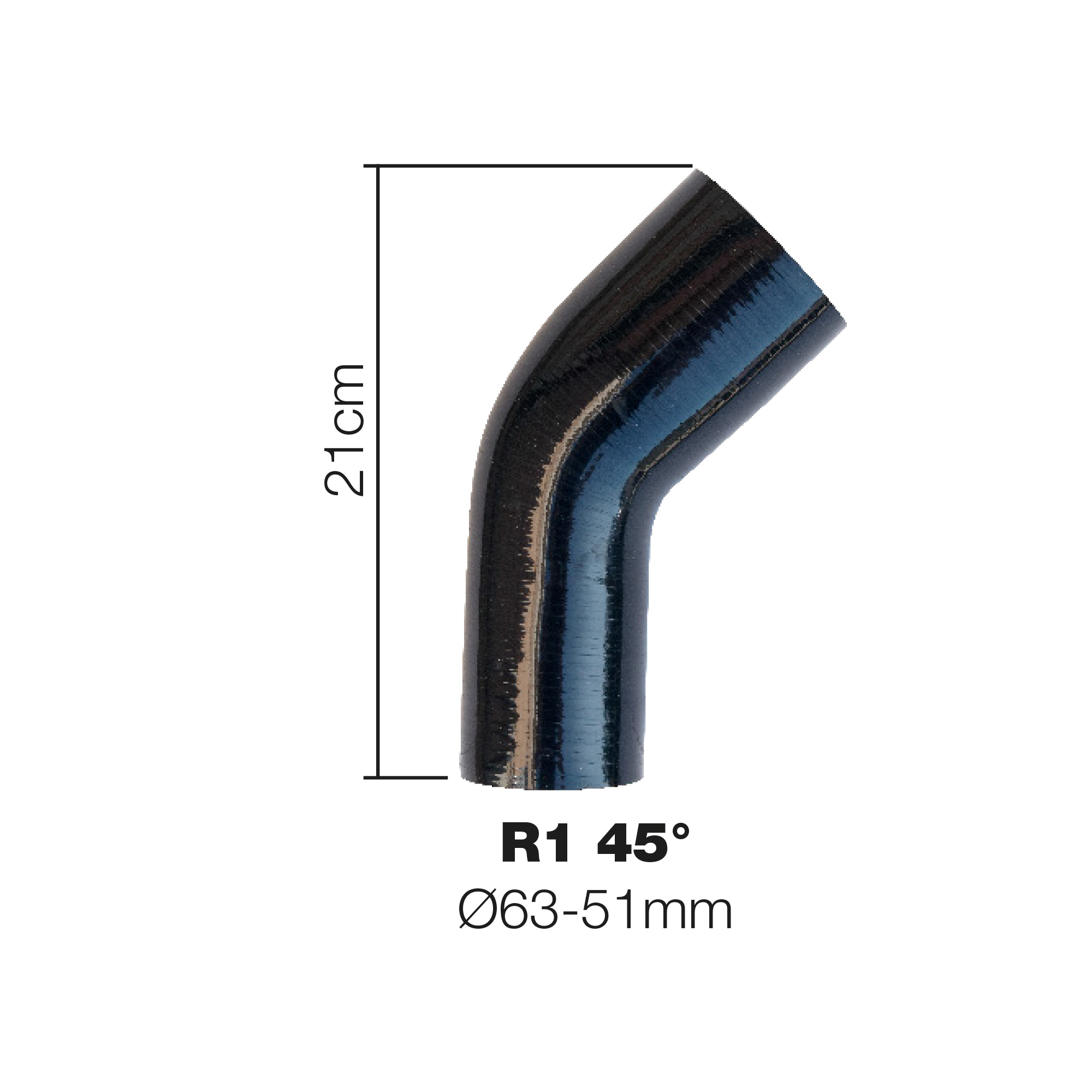 Angolo di 45° e riduzione 63/51 mm ideali per adattare componenti aftermarket e realizzare layout custom su impianti turbo/intercooler.